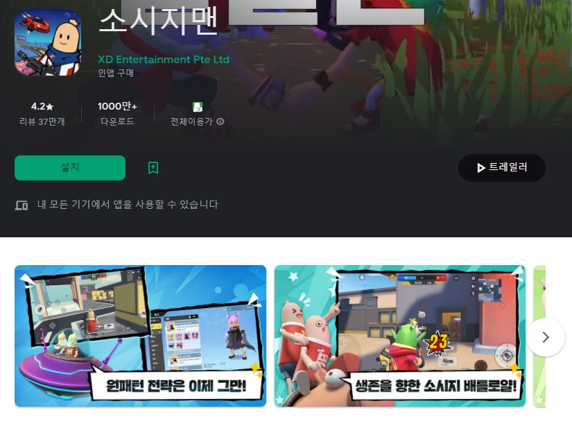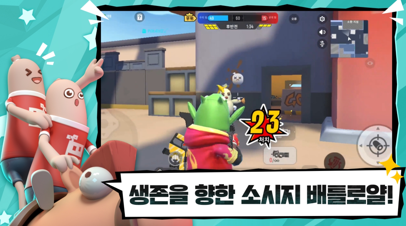 ▶ 전 정말 추천! 배그나 이런 많은 배틀 게임이 있지만 저에겐 이것이 소시지가 귀엽기도하고 특히 싸우면서 두칸 점프를 쓰며 쏠때 정말 잘 맞춰집니다! 배그처럼 피가 나오거나 잔인하진 않아서 좋네요!! 정말 추천합니다 초보분들이 할때는 죽을 때가 많아서 지우겠지만 재능충들이 싸울때는 아주 재미가 있어요 그러니 깔고 재미없어서 지우지 마시고 조금만 더 해보시면 이겨서 재밌으실거에요! 그럼 이 많은 글을 읽어주셔서 정말감사합니다! 그리고 정말 추천! 제작자 잘 됐으면 좋겠네요! 모두들 화이팅!와 대박 이거 확실히 브롤 뛰어넘겠다ㄷㄷ 갓겜 인정 추가 리뷰) 자 이게임의 장점! 전투가 확실히 배그등 차별점이 있다!! 여기서는 맵에 특수한 곳이있어 그 곳에서 파밍하며 아주 짜릿하게 전투한다! 왜냐면 좁거든요 이를테면 해적선등 그리고 패스를 완료하며 얻는 상자등으로 코스튬을 얻어 자랑질 읍읍 아니 그게 아니고 크흠! 나만의 소시지맨을 디자인 할 수 있다!응 개쩐다 와 소시지가 이럴수 있어? 장점 또 있어 들어봐봐 아케이드 모드라고 여기서 배틀로얄외 다른 모드도 즐기며 우와하 웃으며 난리난다ㅋㅋ 흡사 폴가이 같거든? 근데 코스튬이워낙 많으니 또 하는 재미가 있닼 단점: 매칭...인데 그렇게 안 잡히는건 아닌데 기본 몇초만에 되는것도 있고 운없음 1분넘게 기다린적도 있으니 이거 해결하려면 당장 겜 까는 수밖에 없어 이거 본 사람 응 깔아봐 재밌어 함 해보셔 와 오랜만에 할거 찾았네ㅎㅋㅋ
